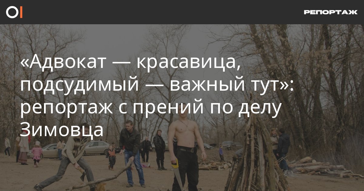 Сидоркина рассказывает, как после заседаний слушатели говорят ей о том, поведение ее подзащитного может привести к реальному сроку. «У моего подзащитного повышенное чувство социальной справедливости», — комментирует адвокат то, что Зимовец «может не знать, как вести себя на судебном заседании». Она просит суд оправдать Зимовца. У сторон нет реплик. «Извините, что я так эмоционально, я волновался. Плохо выступил», — говорит Зимовец. «Все хорошо», — успокаивает его судья.