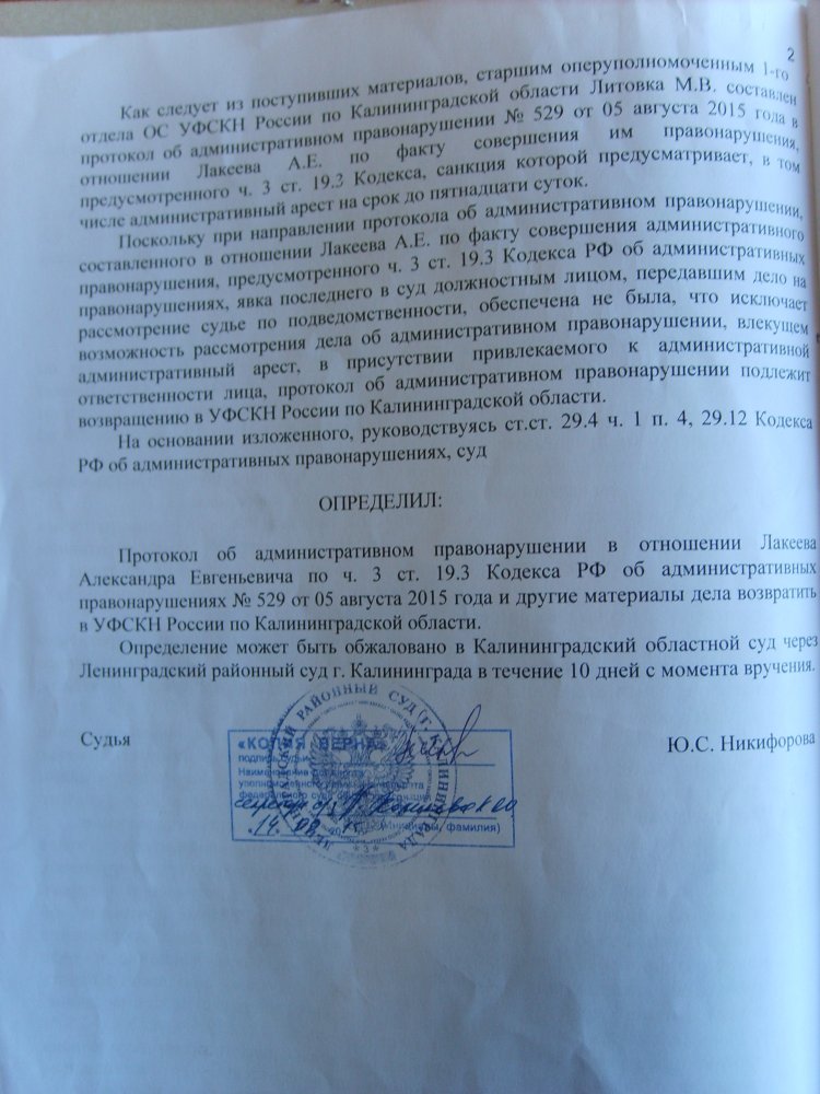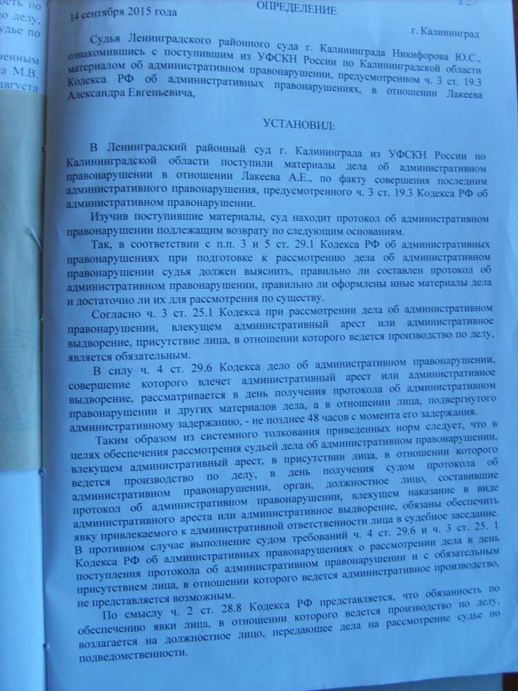 Когда я приехал в суд (Ленинградский районный суд Калининграда — ОВД-Инфо) и посмотрел определение суда, я увидел, что там не указано, что меня надо доставить. Там были изложены все нормы закона, а они от своей безграмотности подумали, что суд разрешил меня привести приводом.