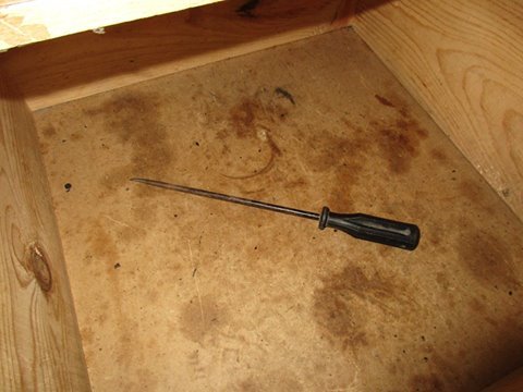 Прокол был округлой формы, размером сечения совпадающий с заточкой, обнаруженной нами в комнате для встреч с осужденными (на фото). Комната эта расположена прямо напротив дежурной части. Полагаю что между заточкой и проколом есть связь, если не прямая, то косвенная. Нет сомнений, что это сделали сотрудники колонии.