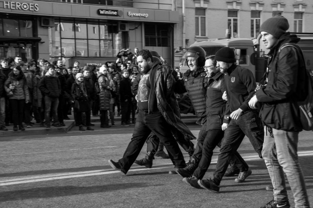 Тут отдельно важно отметить, что на Сретенском бульваре никакого оцепления не было, но, тем не менее, российский суд признал, что Олега Лутина задержали на Страстном бульваре, а Михаила Медовщикова — на Сретенском. А теперь смотрим на фото, на котором видно, что Медовщикова и Лутина задержали вместе. Но по документам — одного на Страстном бульваре, другого — на Сретенском. Вот такой вот российский суд!