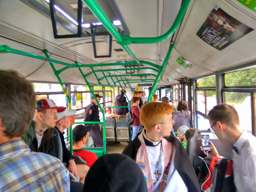 Где-то в 15 часов 13 июня нас вывели в автобус. Мы находились в автобусе долго время, сначала он стоял полтора часа, затем проехал к Невскому районному суду на улице Ольги Берггольц. Опять сотрудник Михаил собрал паспорта и отнес непосредственно судье. Автобус стоял так, что жаркое июньское солнце освещало половину мест и они нагревались. Задержанные собрали куртки и связали их вместо занавесок, которых не было. К автобусу подходил активист Лев Дмитриев, спросил, хотим ли мы еды, затем ушел и вернулся с двумя пакетами, полными печенья, фруктов, нарезанного батона и колбасы, водой. Сотрудники полиции передали передачку.
