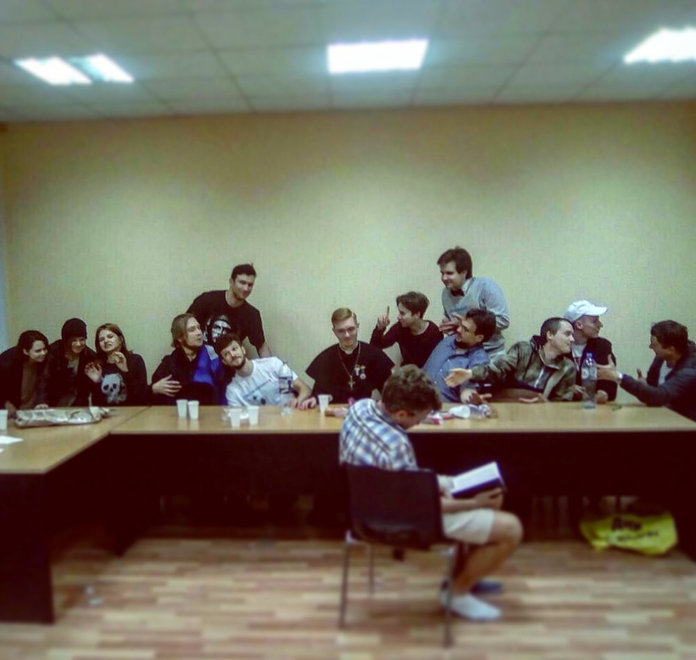 Вот уже вечер. Общаемся с ребятами, думаем о том, как хреново, если отпустят позже 00:00, потому что до дома придется брать такси. Смеемся со всего. Ответная реакция на стресс, иначе можно сойти с ума. Столы стоят так, что нам приходит идея разыграть тайную вечерю. Тем более, что глас Божий среди нас — отец Александр (священник Ассоциации христианских евхаристических общин, открытый гей, постоянно участвует в различных протестах и несколько раз был задеражн — ОВД-Инфо).