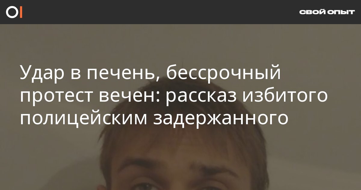 Затем к нам зашли четверо или пятеро полицейских, один из них даже представился и показал документы после нашей просьбы. Он предложил пройти с ним. Я сказал, что у меня очень болит живот и я никуда не пойду, так как считаю происходящее незаконным. «Выйду из автозака только для того, чтобы проследовать в скорую», — говорю. Один полицейских достал камеру и стал светить фонарем мне в лицо, спрашивая: «То есть вы отказываетесь проследовать с нами?» Я понял, к чему он ведет, и ответил, что не собираюсь препятствовать законным действиям сотрудников полиции, но при задержании не был составлен протокол, мне не объяснили, за что меня задержали, и так далее и тому подобное, ваши действия незаконны. У них так замкнуло в голове, они не знали, что дальше делать, и просто раз за разом спрашивали: «То есть, вы отказываетесь? Отказываетесь? Отказываетесь?» Они потерялись и не понимали, как им поступить. Полицейский с камерой убрал ее, выключил фонарик. Остальные люди в автозаке тоже стали отказываться выходить прежде, чем мне вызовут скорую.
