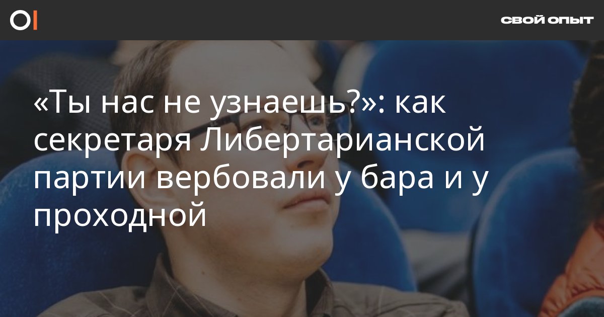 Секретаря Либертарианской партии России Алексея Овсиенко пытались завербовать сотрудники Центра «Э» и ФСБ. Для этого они встречали его у бара и после работы. Овсиенко сразу позвонил юристу и написал об этом в соцсетях. Благодаря обсуждению в фейсбуке, он смог опознать оперативников.