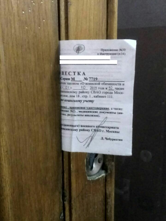 В самом начале августа я нашел повестку из военкомата, которая торчала в дверном косяке. Причем не в моей двери, а в двери, которая отделяет подъездную площадку от холла с квартирами. В повестке было написано, что мне нужно явиться в военкомат 1 октября для уточнения материалов воинского учета. Все правильно, но обычно такую повестку присылают в октябре: каждый осенний призыв мне нужно предоставлять в военкомат бумажку о том, что я учусь в вузе. Сама повестка правомерная, но странно, что ее принесли в августе, и непонятно, почему не положили в почтовый ящик.