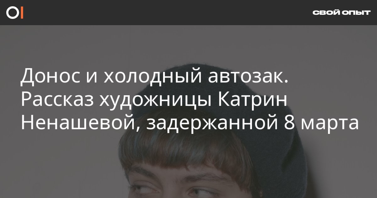 Арт-активистку Катрин Ненашеву задержали 8 марта в Петербурге по наводке гомофоба Тимура Булатова. Несколько часов активистку держали в холодных полицейских машинах и привезли в Ленинградскую область, где сняли у нее отпечатки пальцев, а затем отпустили. ОВД-Инфо публикует монолог Ненашевой.