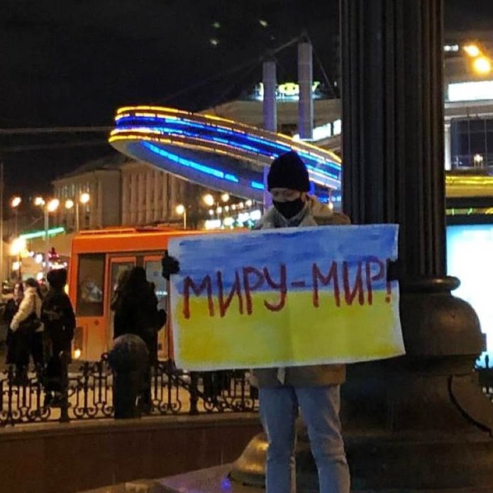 В общем, пришел я на улицу Баумана и встал с пикетом, развернув свой плакат — кусок обоев, на котором был нарисован флаг Украины и написано «Миру — мир». То есть даже не антивоенный плакат, а за мир в широком смысле. Простоял я так буквально минуту. Ко мне тут же подошли сотрудники полиции. Представились, попросили меня предъявить документы — я показал паспорт. Сообщили, что я нарушаю порядок проведения акции, и отвели в автозак.
